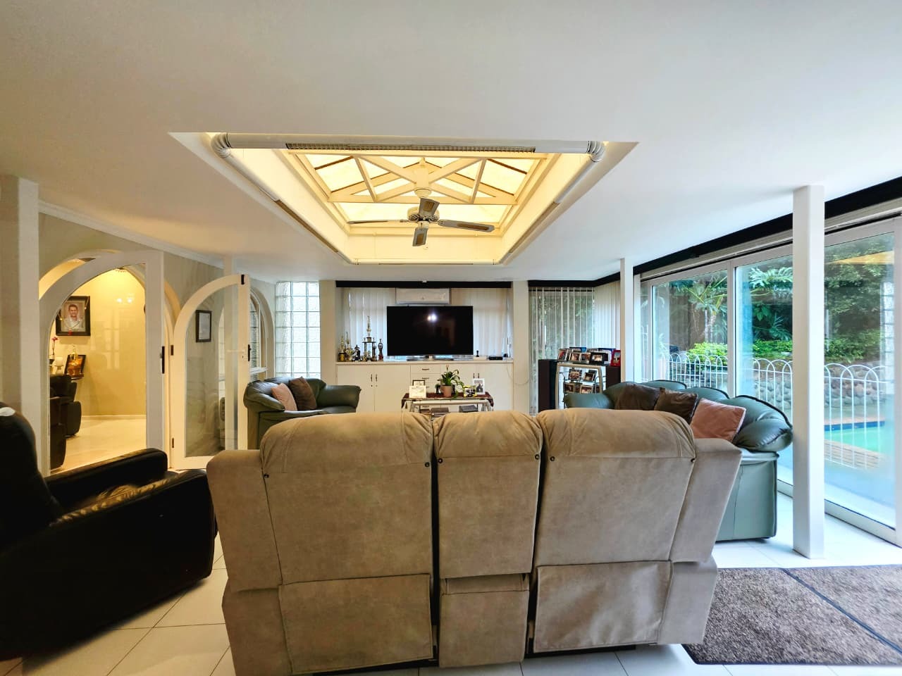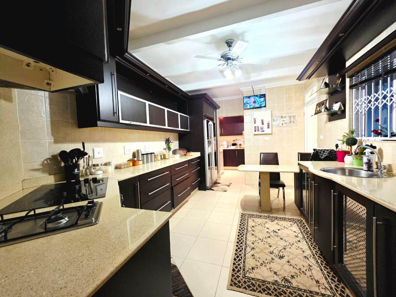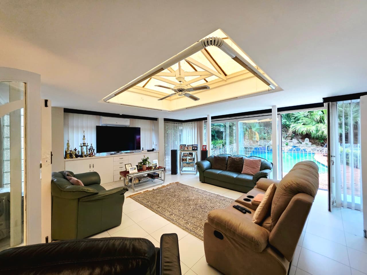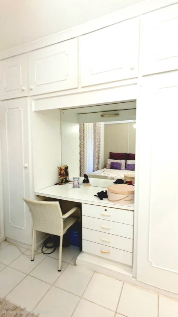 Step inside and you’ll find three well-sized bedrooms, each fitted with built-in cupboards and air-conditioners to ensure year-round comfort. The main bedroom boasts its own private en-suite bathroom, while the home offers an additional full bathroom with both a tub and shower, plus a guest toilet. Multiple living areas, including a family room and TV lounge, provide plenty of space to relax and entertain. The fully fitted kitchen is both practical and stylish, complete with a scullery, pantry, and laundry area.