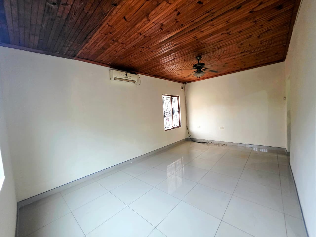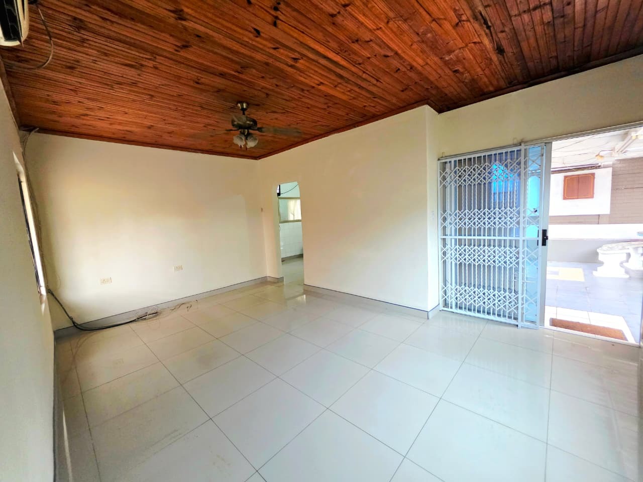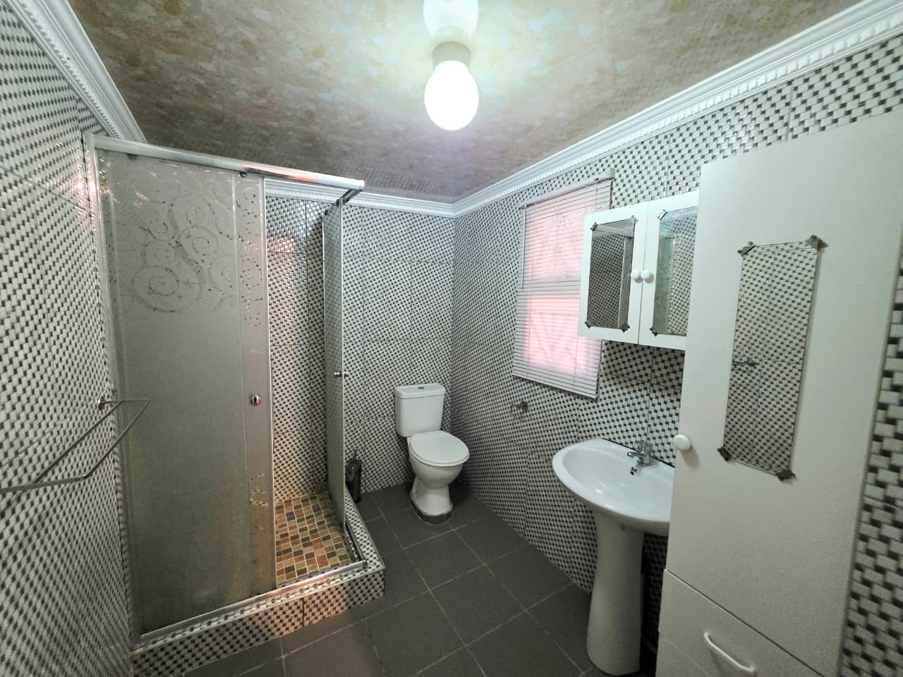 All three bedrooms are well-sized and fitted with ceiling fans for comfort. The home includes a master bedroom with an en-suite bathroom (shower and toilet), while another bedroom offers built-in cupboards and the third incorporates a clever space-saving design. In addition to the en-suite, there is a separate guest shower and toilet, ensuring convenience for both residents and visitors. The home is further complemented by elegant knotty pine ceilings and durable aluminum windows throughout.