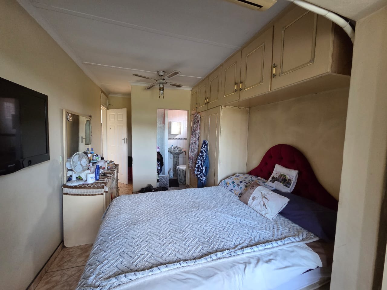 Upstairs, you'll find three generously sized bedrooms, all with built-in cupboards. Two of the bedrooms come with ceiling fans, while the main bedroom boasts its own en-suite bathroom. A full main bathroom serves the other bedrooms.