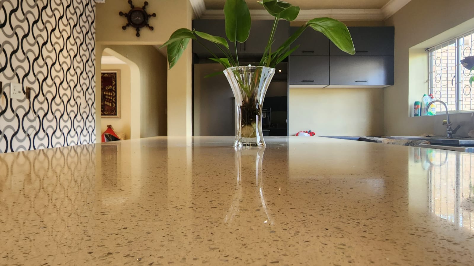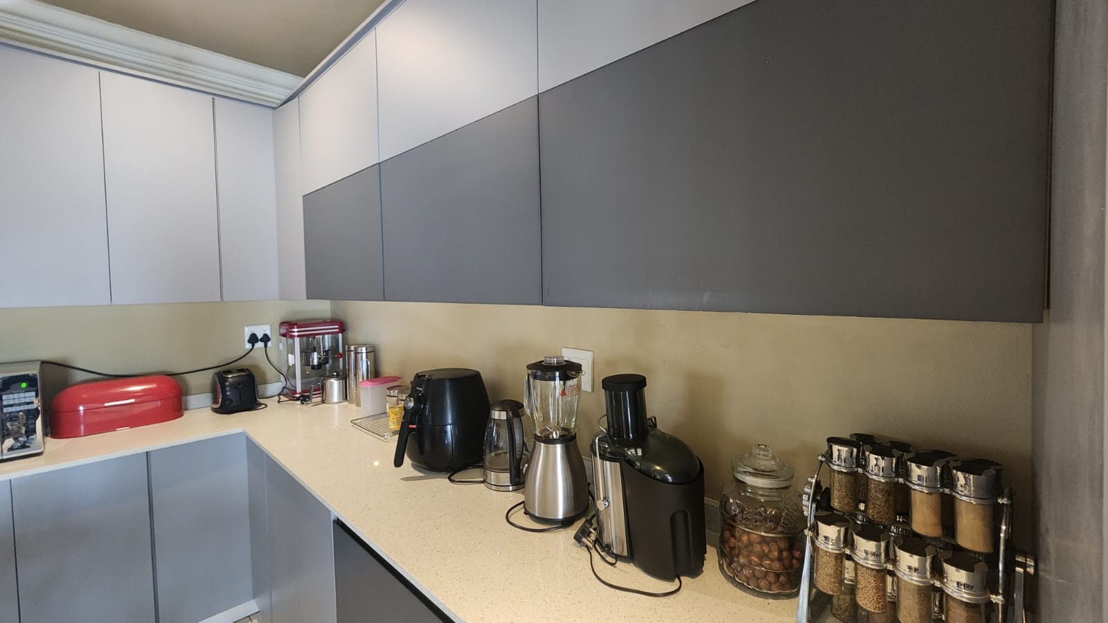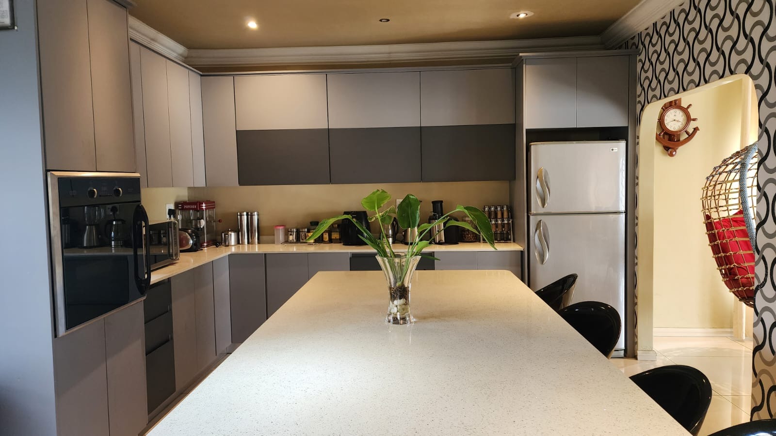 - Designer main kitchen with sleek Caesar stone tops and modern cabinetry