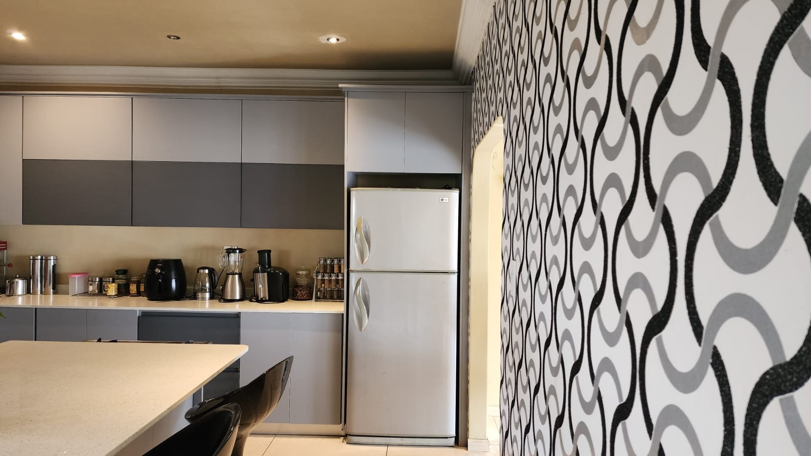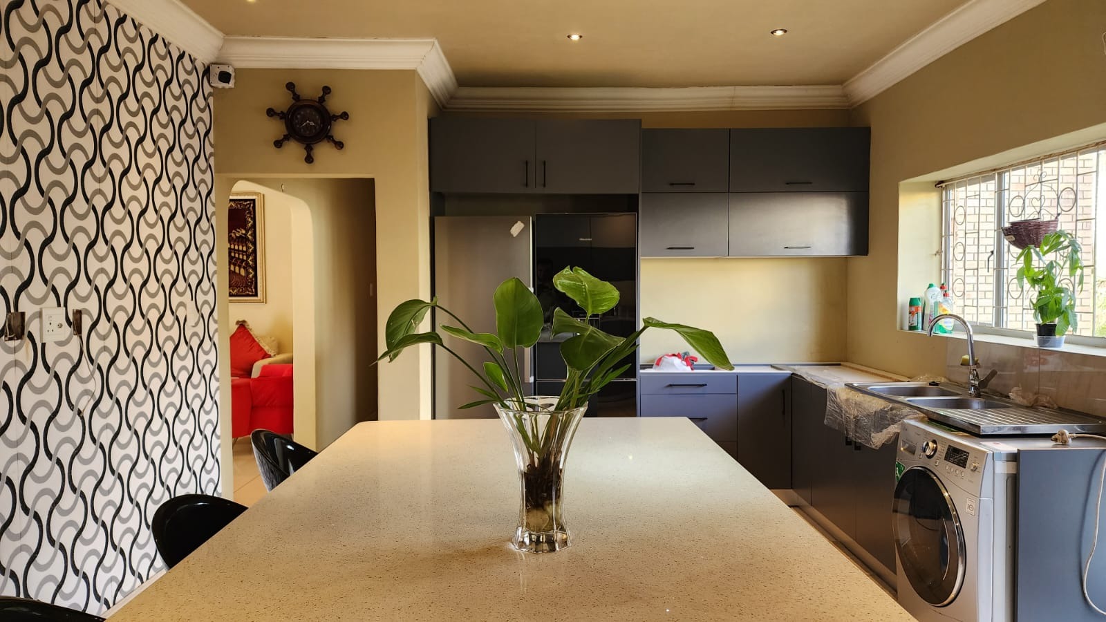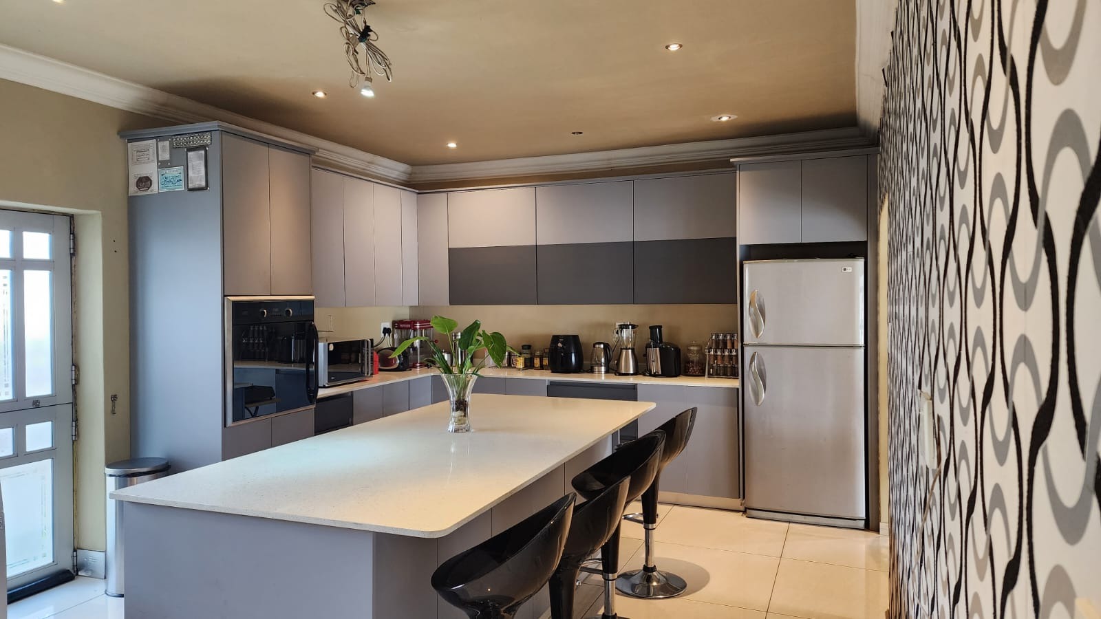 - Designer main kitchen with sleek Caesar stone tops and modern cabinetry