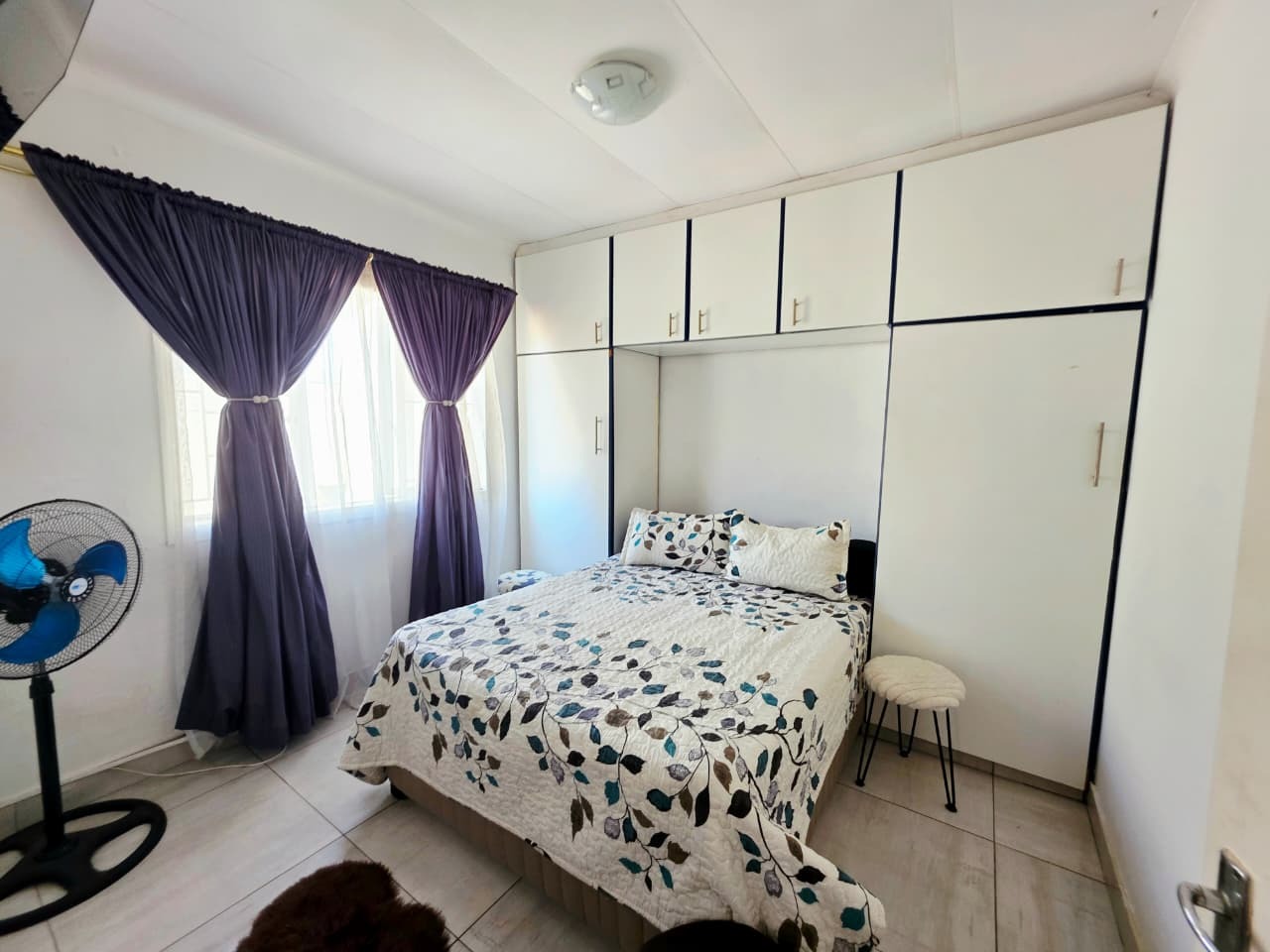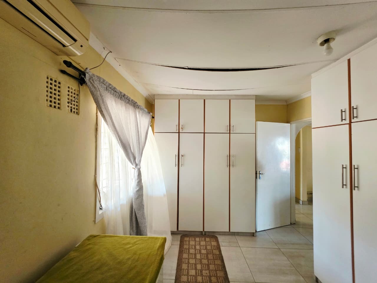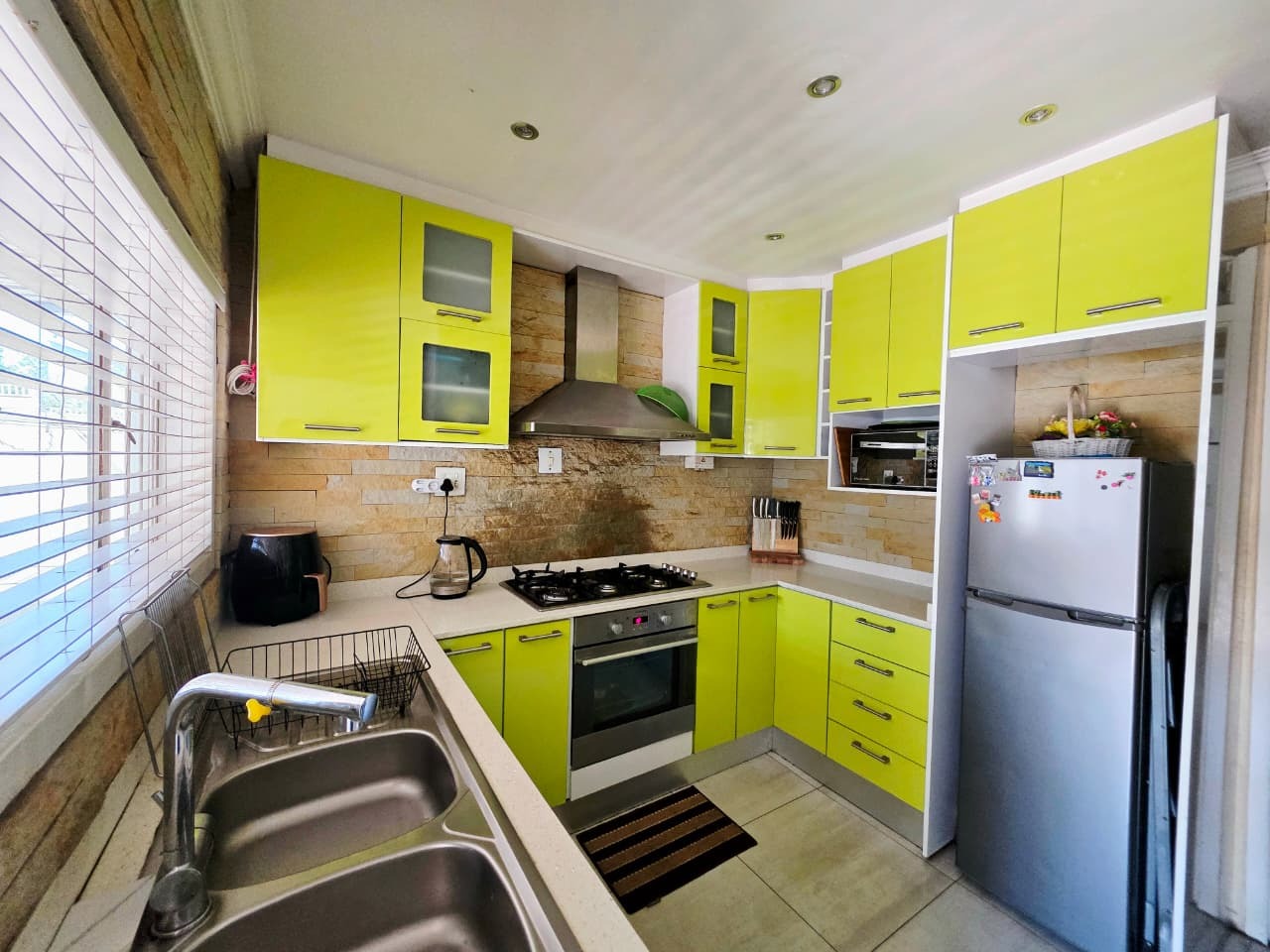 All three bedrooms include built-in cupboards and air-conditioners, ensuring both comfort and functionality. One of the bedrooms opens onto a balcony with elevated views of the surrounding area, thanks to the property being above road level.