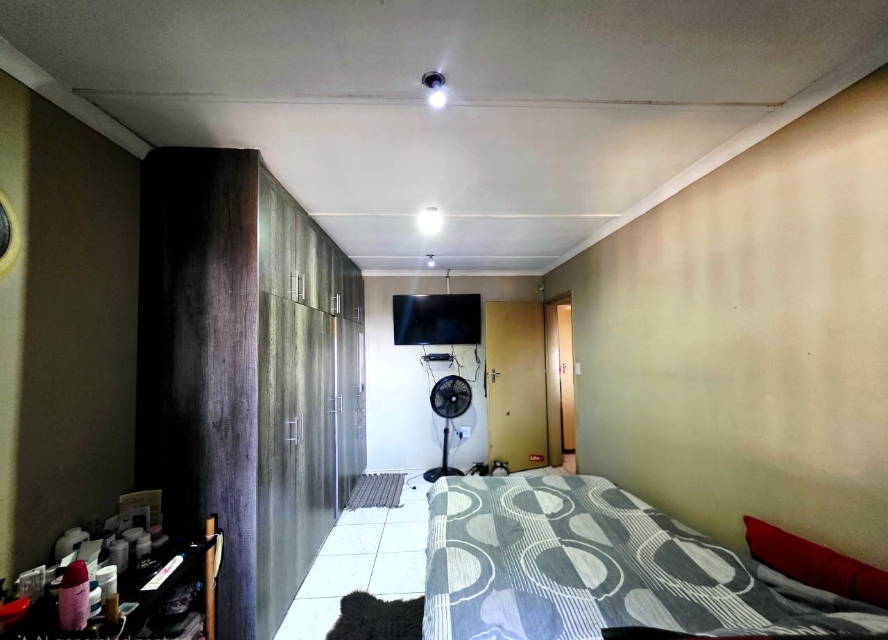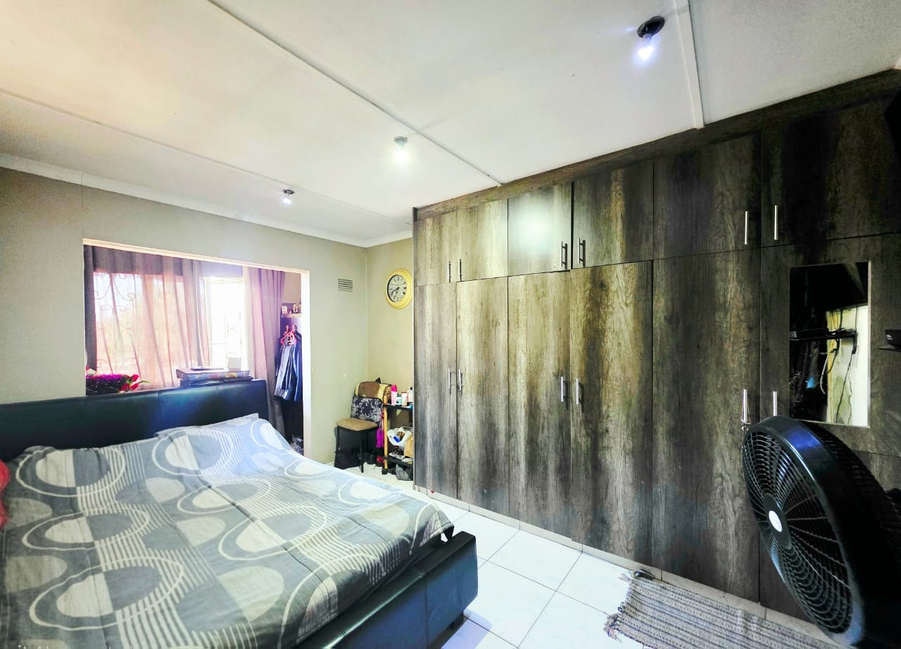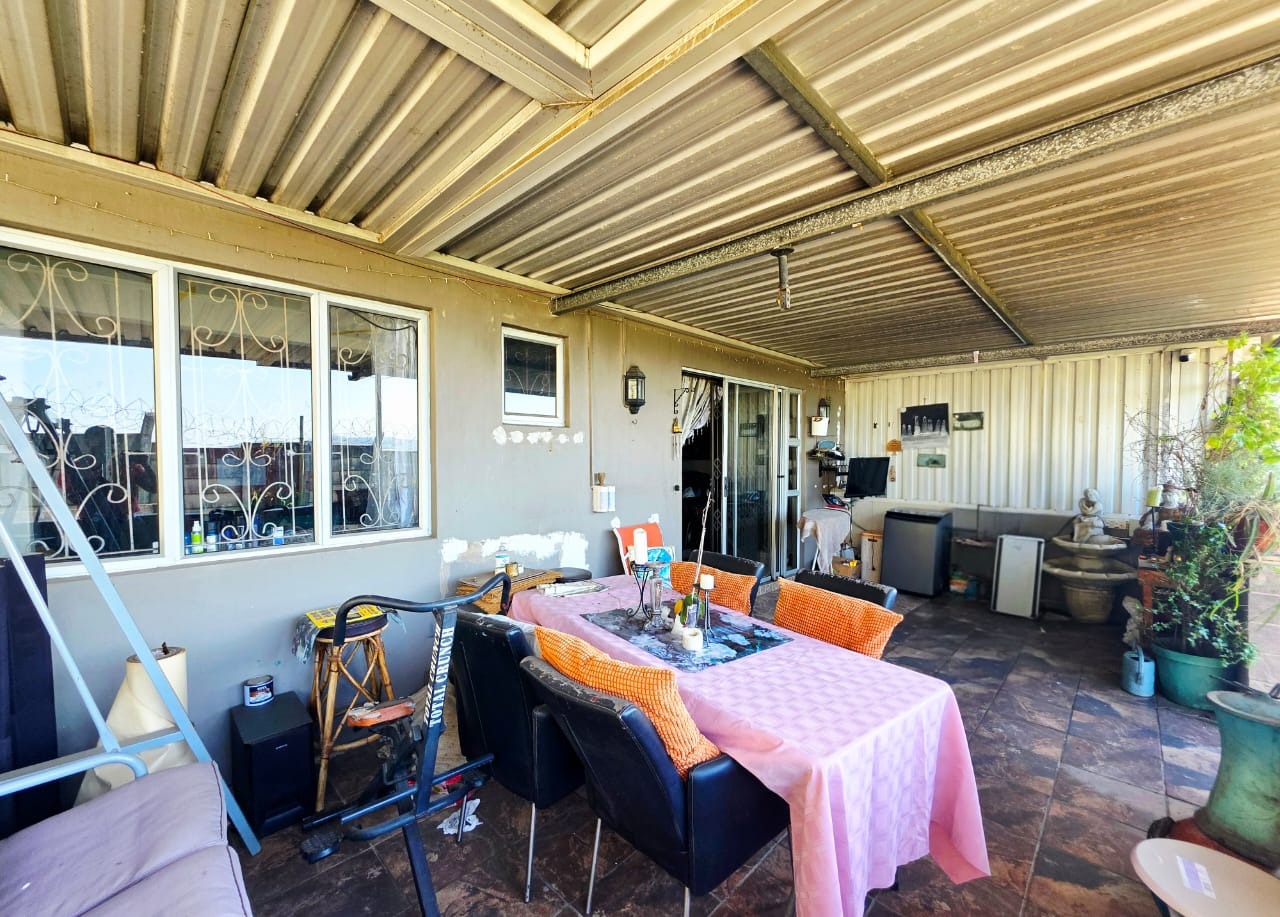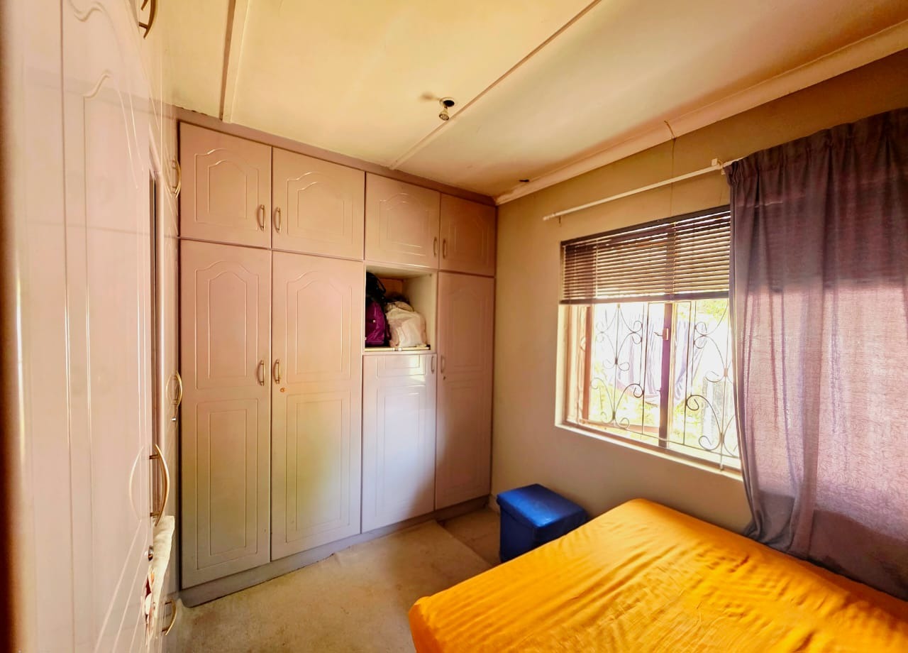 The fully fitted kitchen includes built-in cupboards, ideal for easy meal preparation and storage. The cozy lounge area opens onto a patio—perfect for outdoor relaxation, entertaining guests, or enjoying braais in the generous backyard.