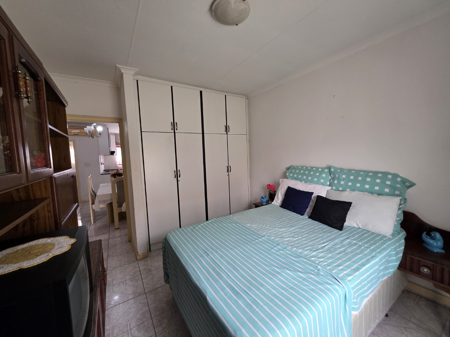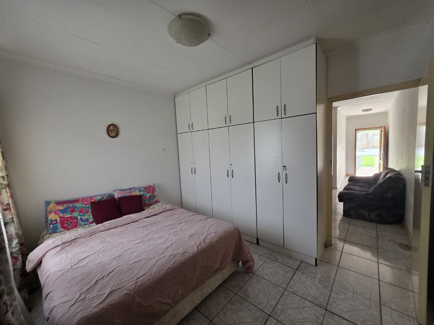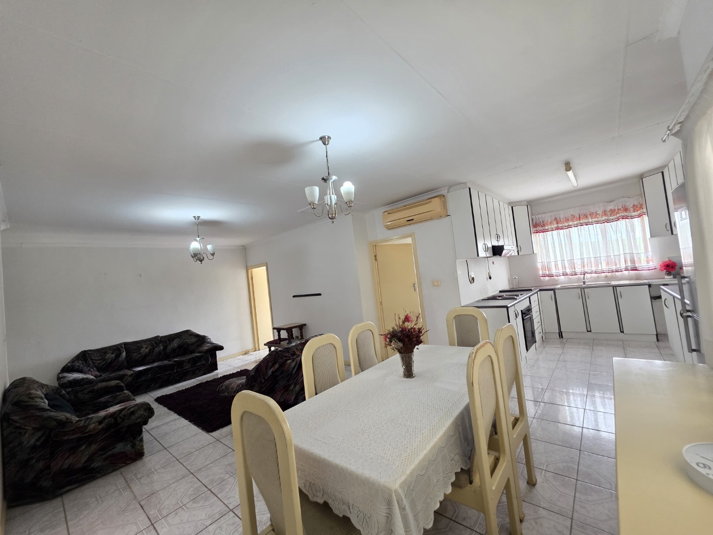 The flat is fully tiled throughout and features a fully fitted kitchen with ample cupboard space. All three bedrooms are generously sized and fitted with built-in cupboards. A very spacious open-plan lounge and dining area offers comfortable living and entertaining space, while a small private balcony adds extra charm.