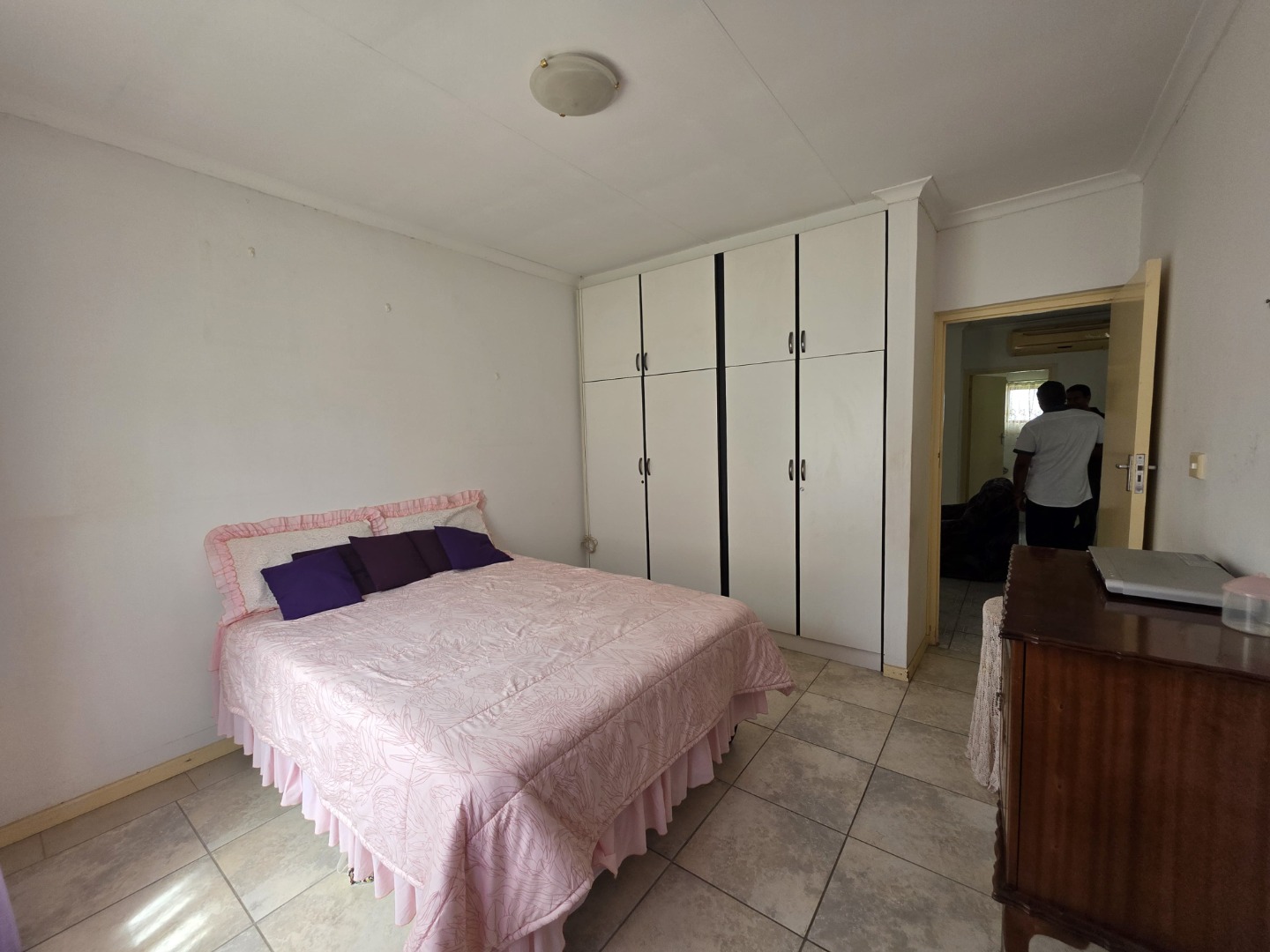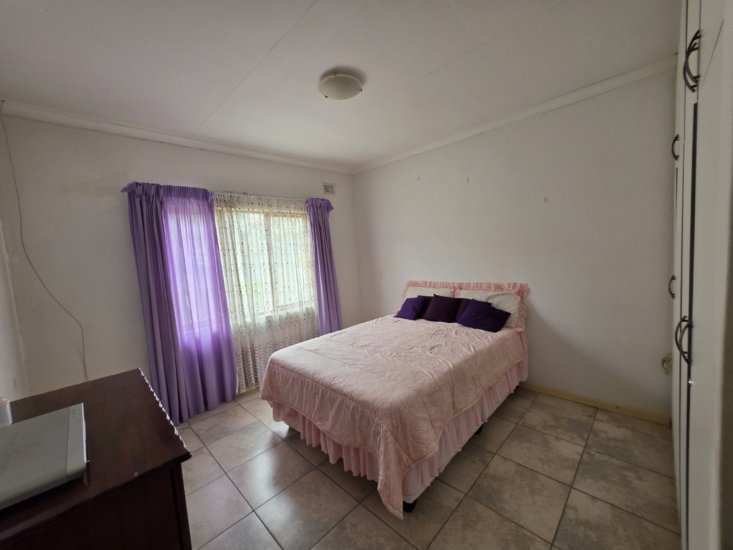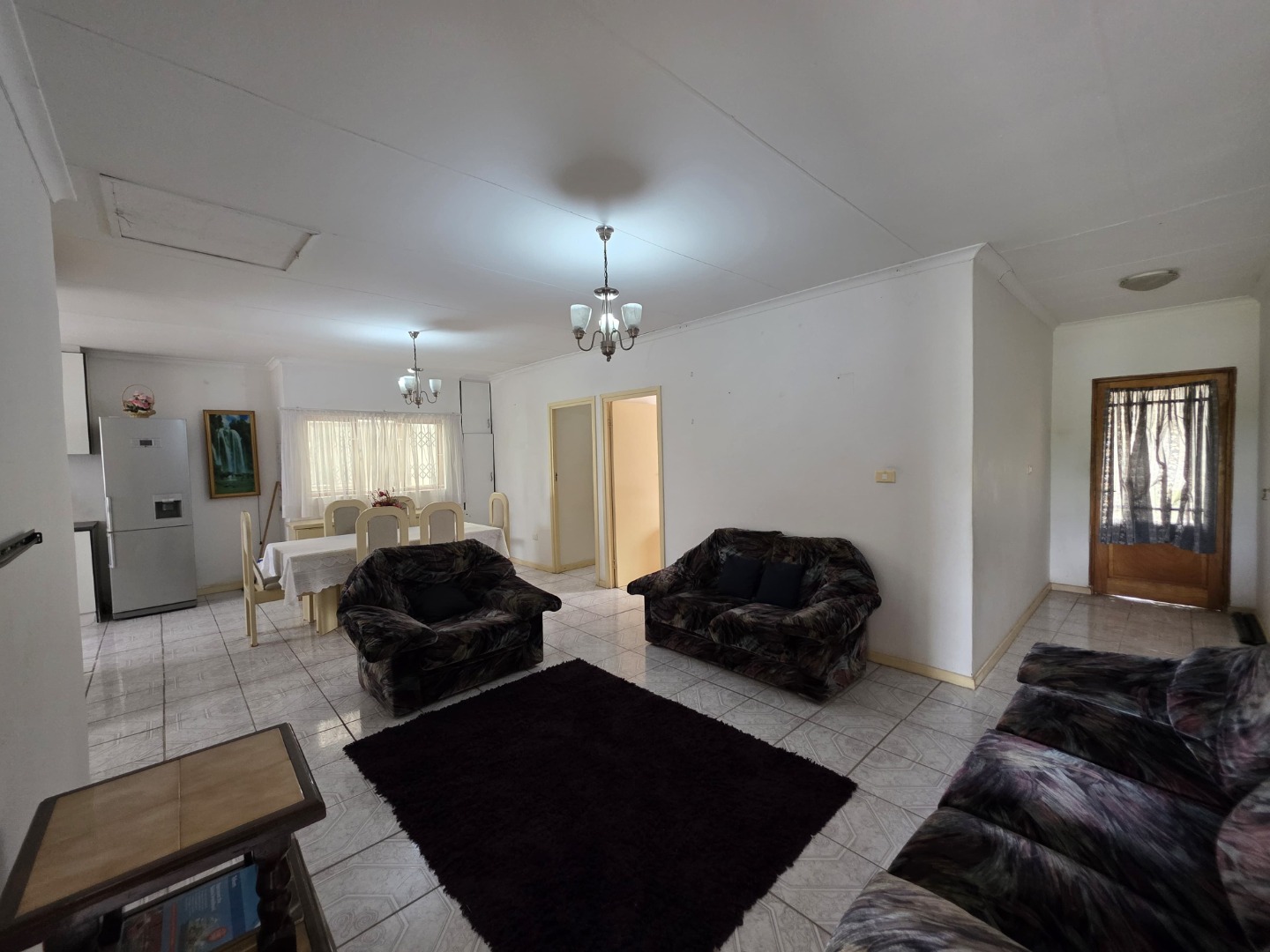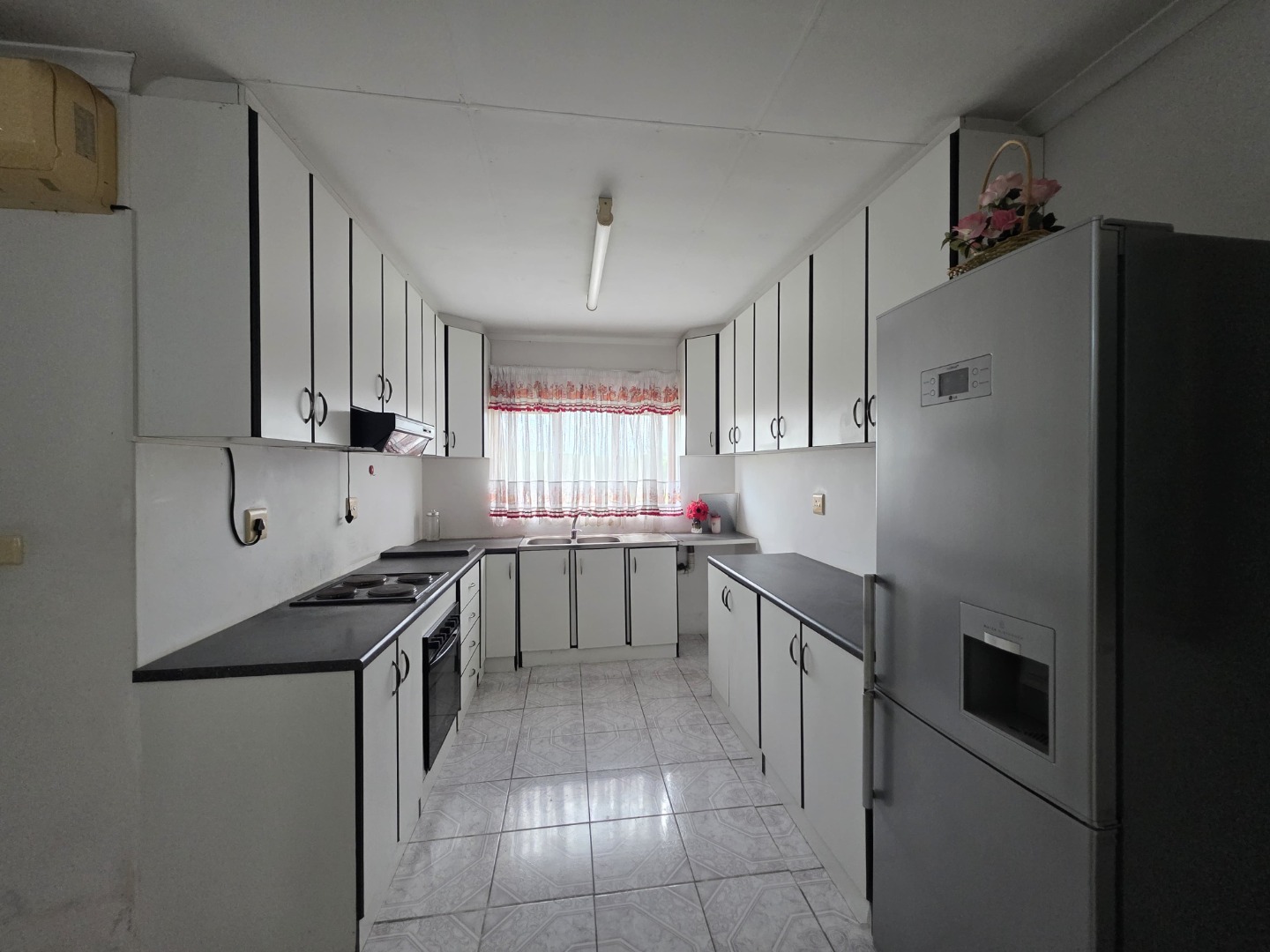 The flat is fully tiled throughout and features a fully fitted kitchen with ample cupboard space. All three bedrooms are generously sized and fitted with built-in cupboards. A very spacious open-plan lounge and dining area offers comfortable living and entertaining space, while a small private balcony adds extra charm.