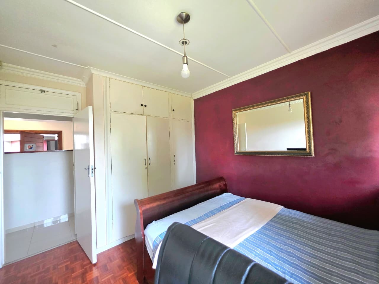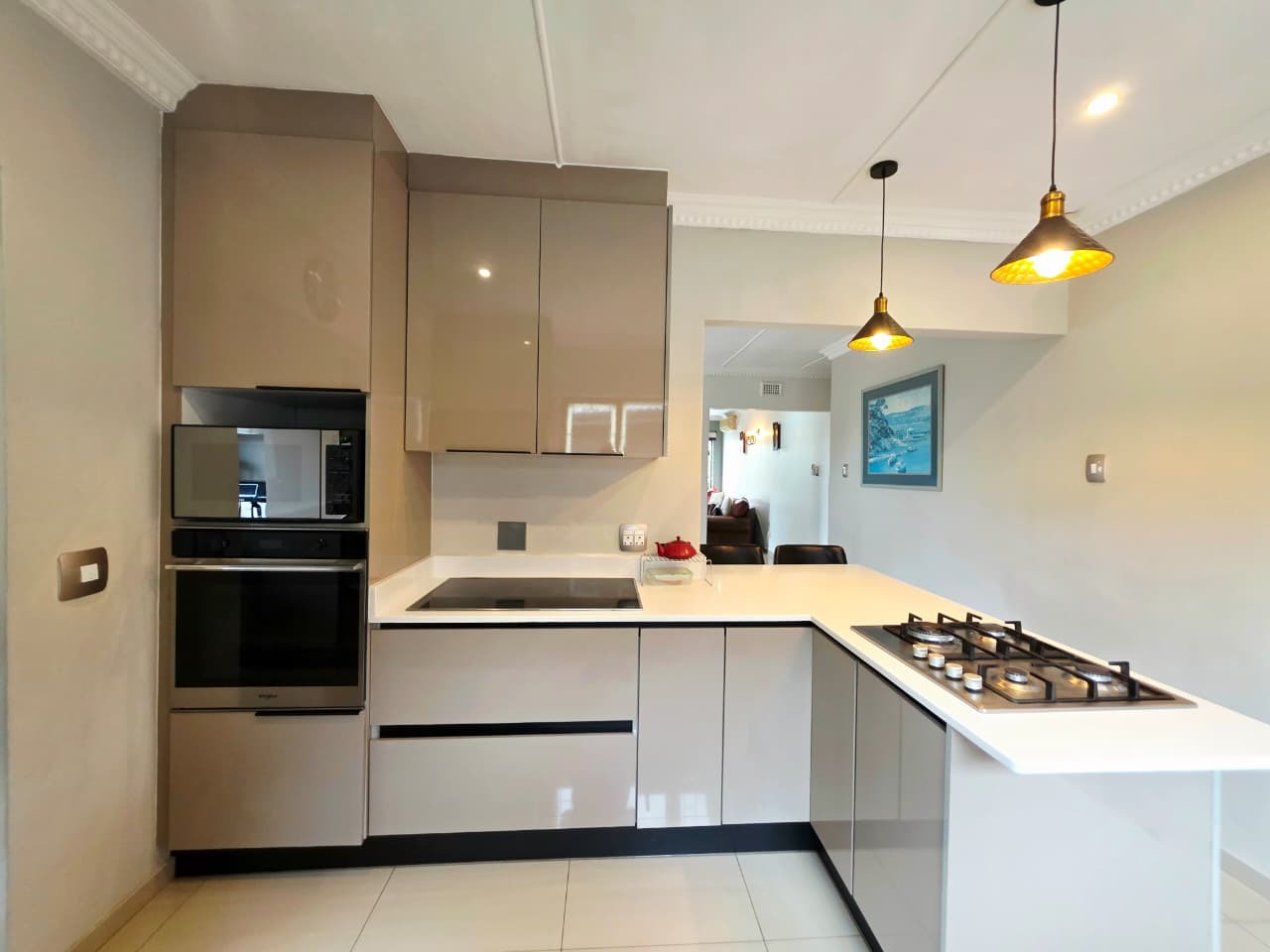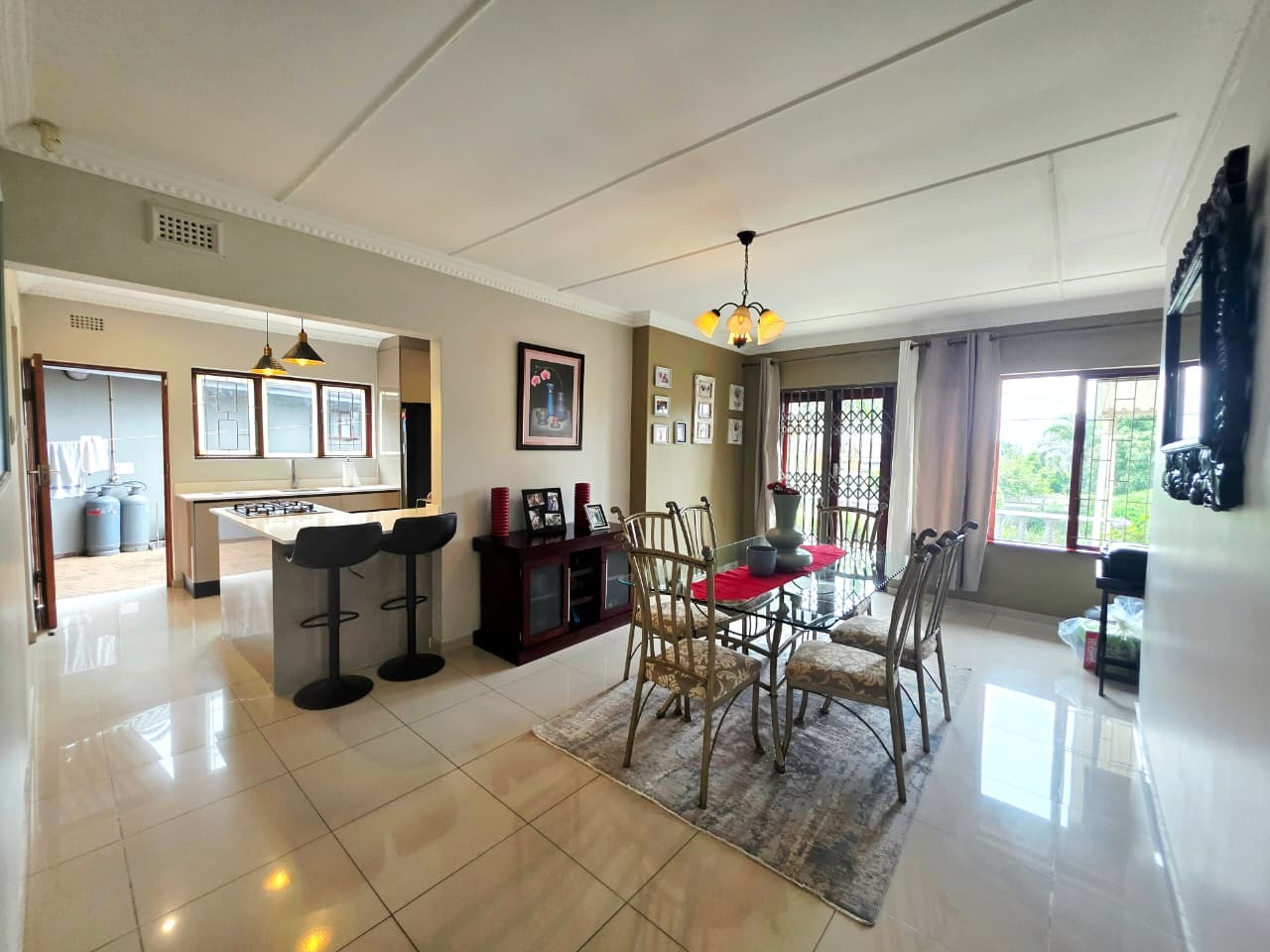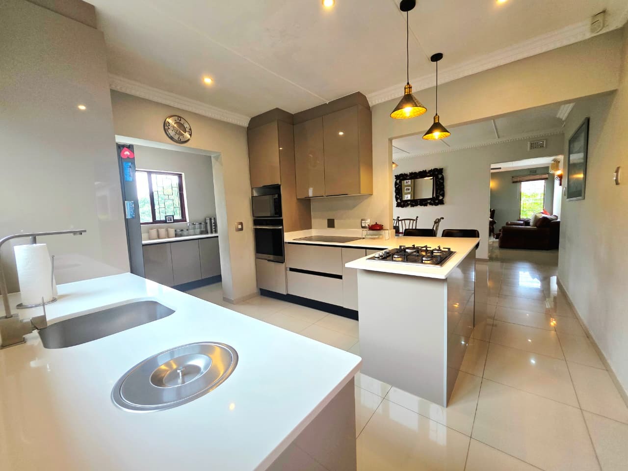 At the heart of the home lies a thoughtfully designed gourmet kitchen, complete with a gas hob, built-in electric oven, generous cabinetry, and a separate scullery that keeps the main kitchen beautifully uncluttered. It is a space where functionality meets refined design, perfect for everything from casual breakfasts to memorable dinner gatherings.
