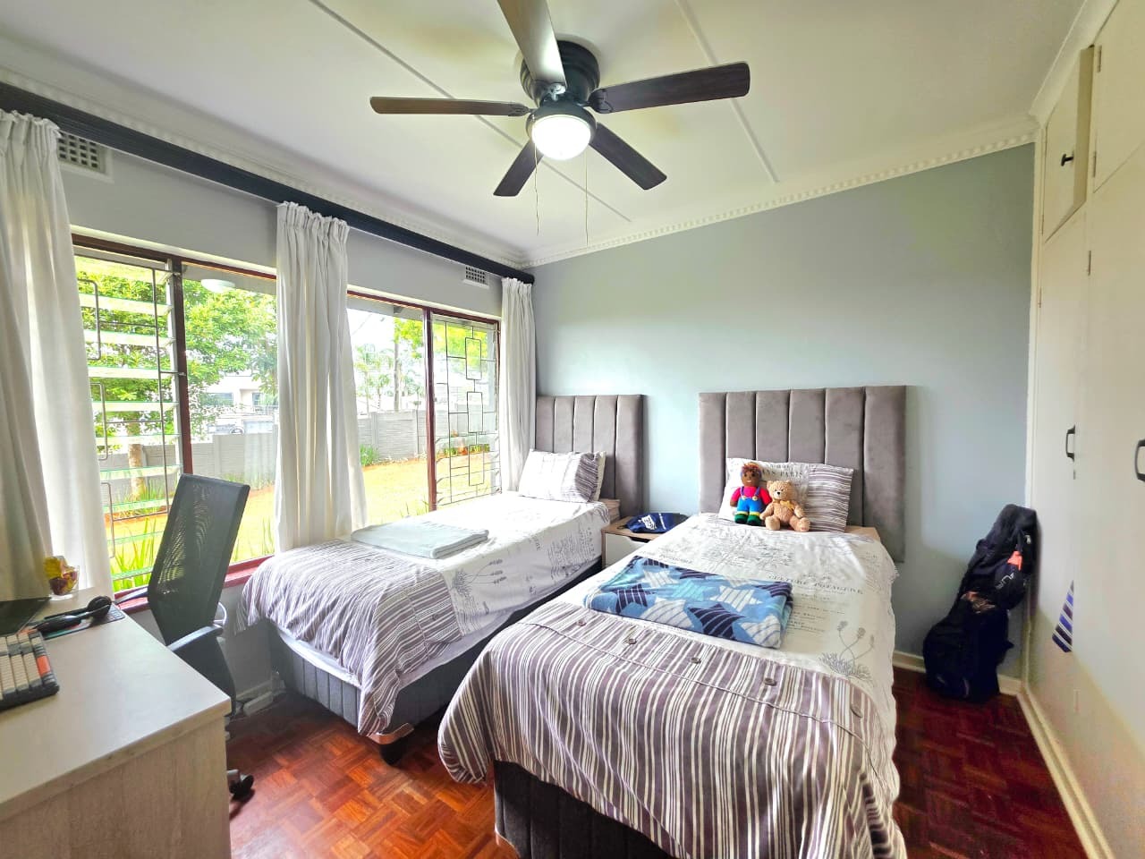 The outdoor area is an entertainer’s dream. A covered patio with a built-in braai overlooks a sparkling swimming pool and expansive garden, creating a private sanctuary for weekend entertaining, relaxed family afternoons, or peaceful evenings under the coastal sky. The level, generously sized land offers abundant space for children and pets, while also presenting exciting potential for future additions.