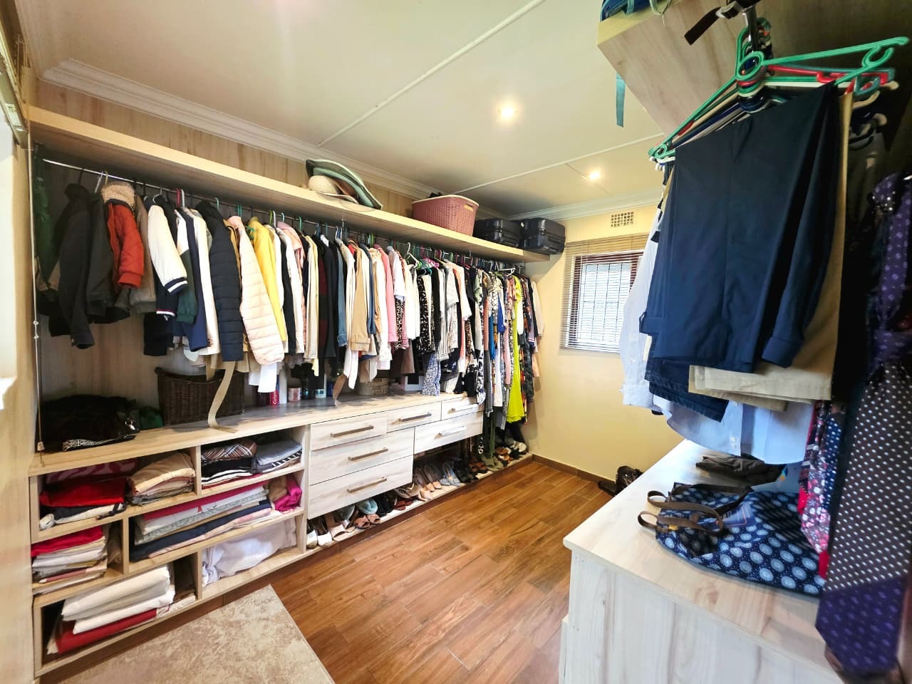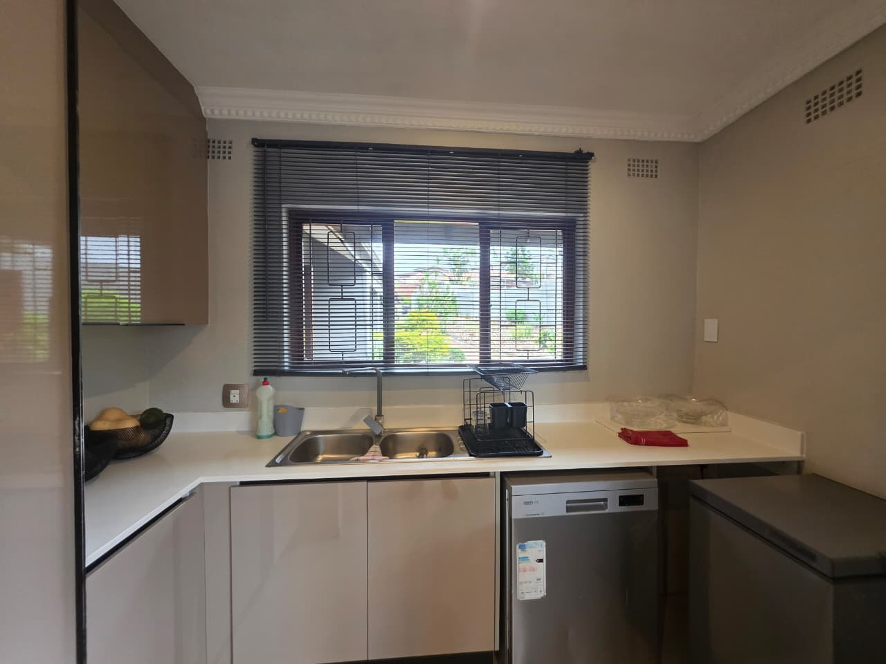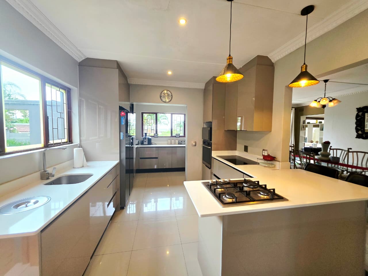 At the heart of the home lies a thoughtfully designed gourmet kitchen, complete with a gas hob, built-in electric oven, generous cabinetry, and a separate scullery that keeps the main kitchen beautifully uncluttered. It is a space where functionality meets refined design, perfect for everything from casual breakfasts to memorable dinner gatherings.
