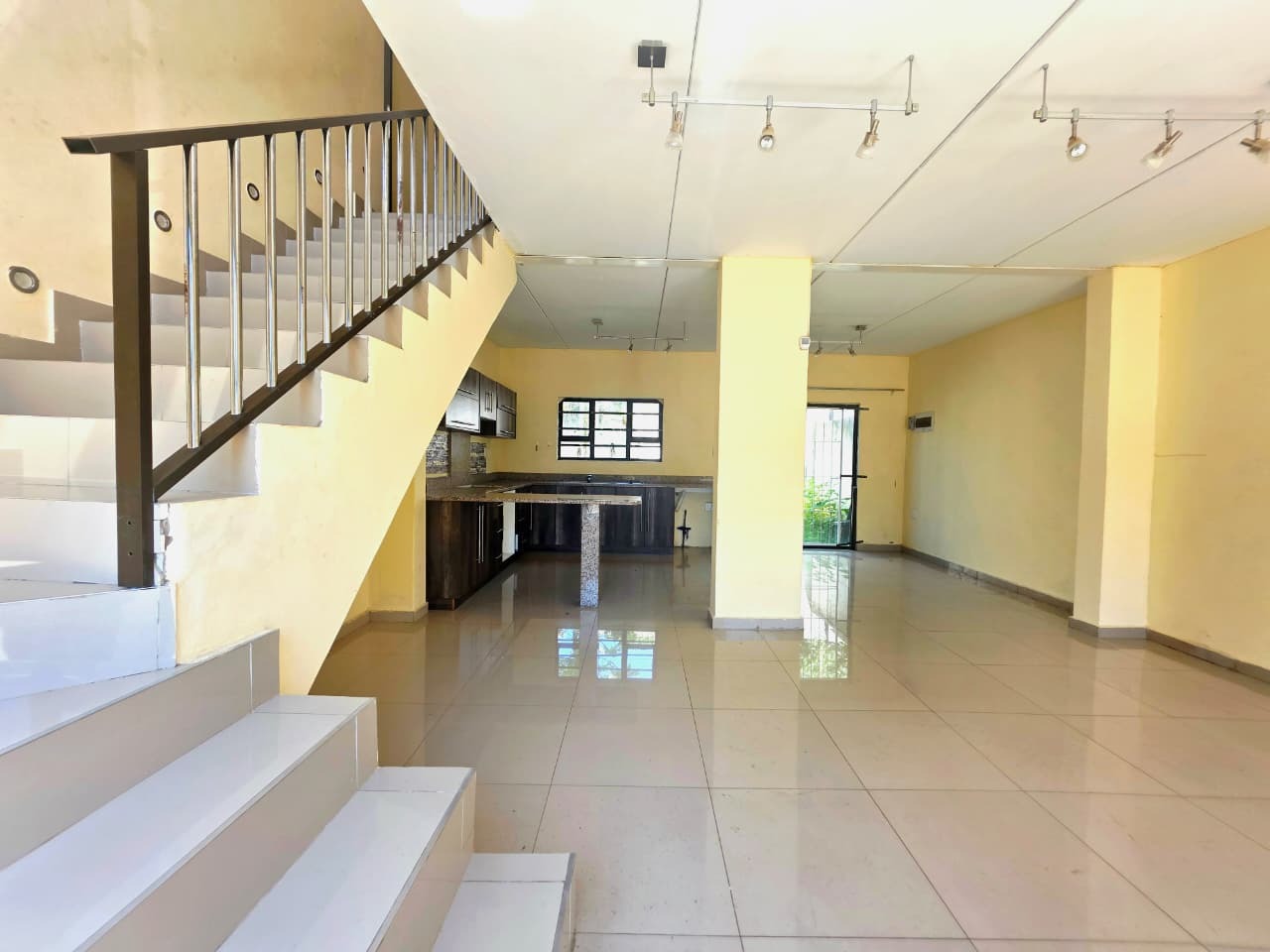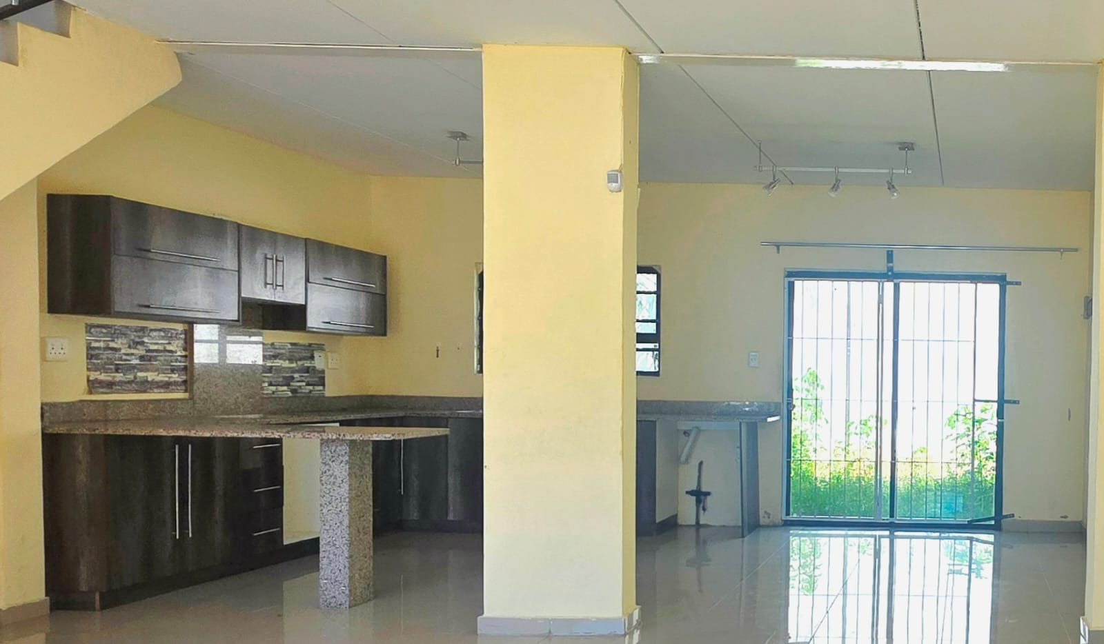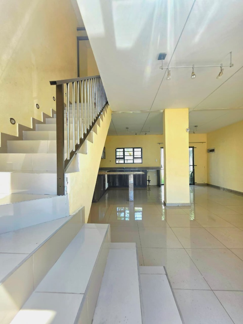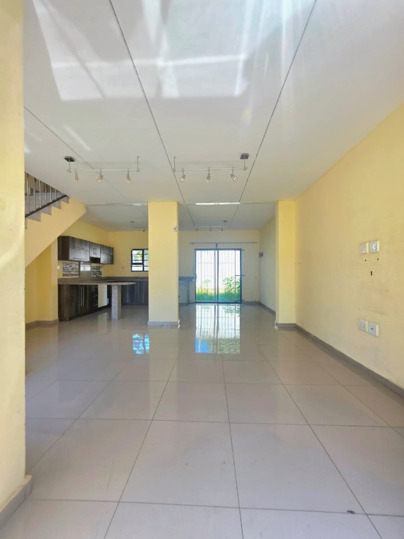 This 98 sqm residential unit in Cordoba Gardens, Verulam, offers a modern, open-plan living experience. The ground floor features a spacious lounge area seamlessly flowing into the kitchen. The kitchen is equipped with contemporary dark cabinetry and granite-look countertops, complete with a breakfast bar, providing a functional space ready for completion. Tiled flooring extends throughout the unit, ensuring a clean and low-maintenance environment. A modern tiled staircase with a sleek metal railing leads to the upper level, enhancing the contemporary aesthetic. The unfurnished interior provides a blank canvas, allowing new owners to personalise the space to their exact preferences.
