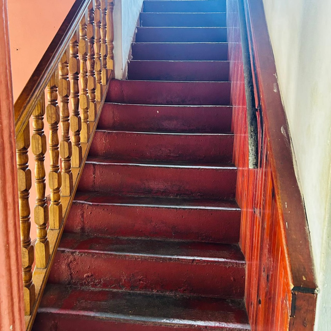 The home features three spacious bedrooms with vinyl tiles, a warm lounge and dining area with wooden ceilings, and a kitchen ready for transformation. A staircase leads to a private upstairs section complete with a full bathroom. A second bathroom downstairs adds convenience.
